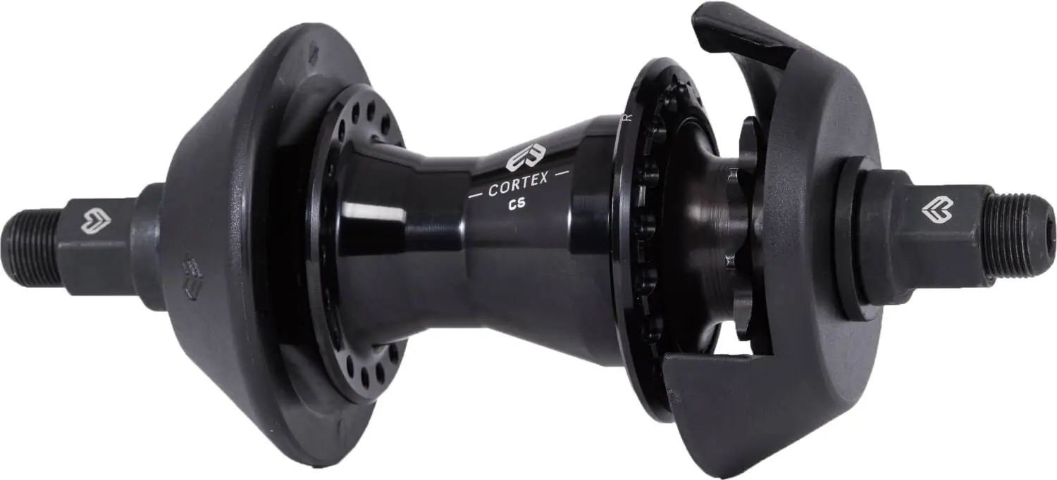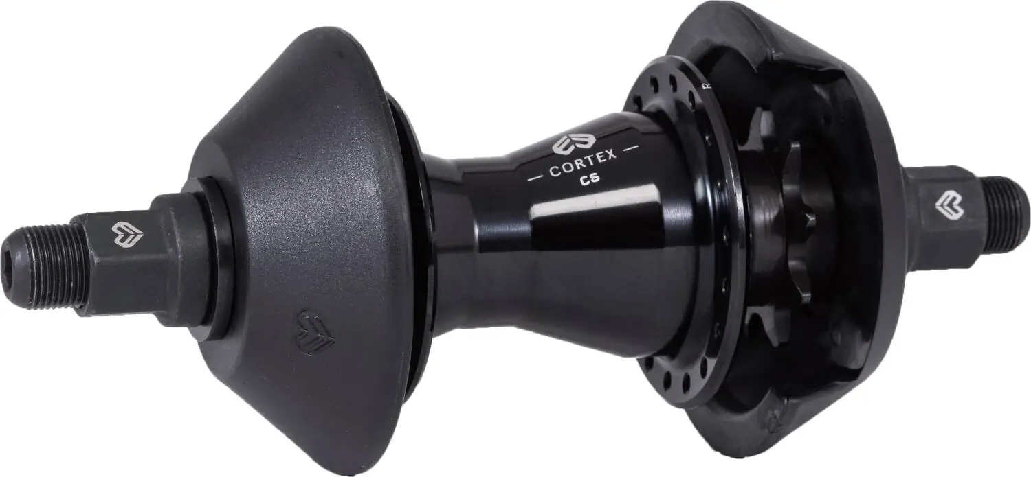 El Cortex Trasero de Éclat es un buje de casete diseñado para ruedas de BMX de freestyle. Los bujes que vienen con un eje macho se montan en las punteras con una tuerca.