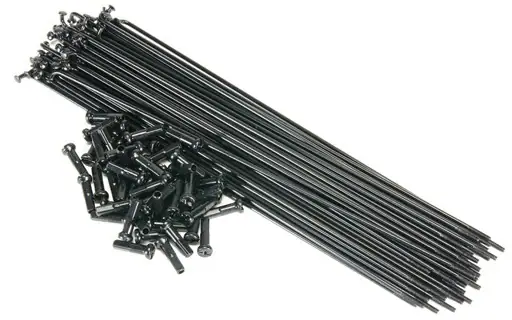 Juego de 40 duraderos radios de acero inoxidable construidos por Eclat BMX. Vienen con cabecillas de radio de 16mm (nipples) metálicas y negras.