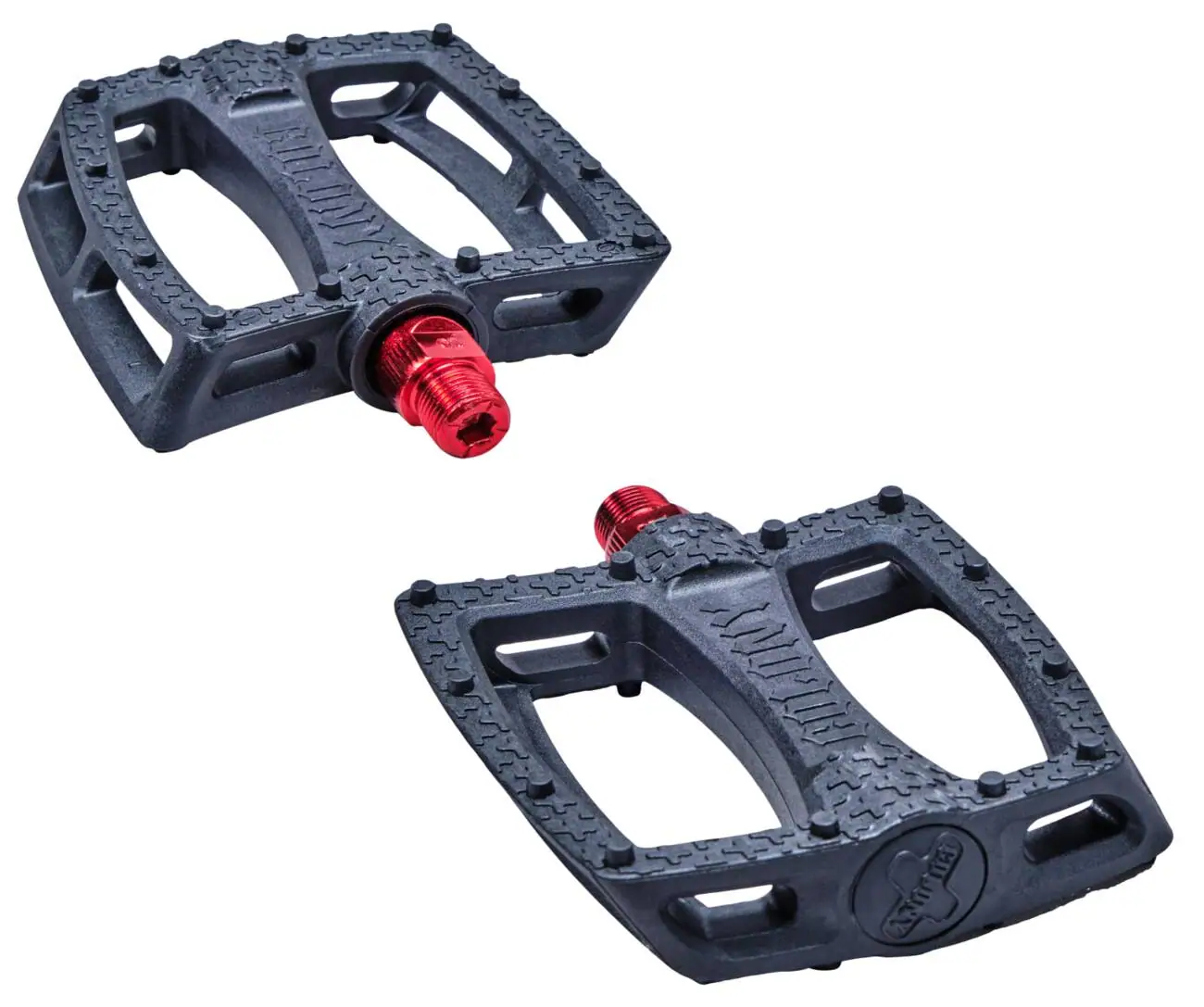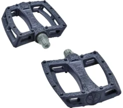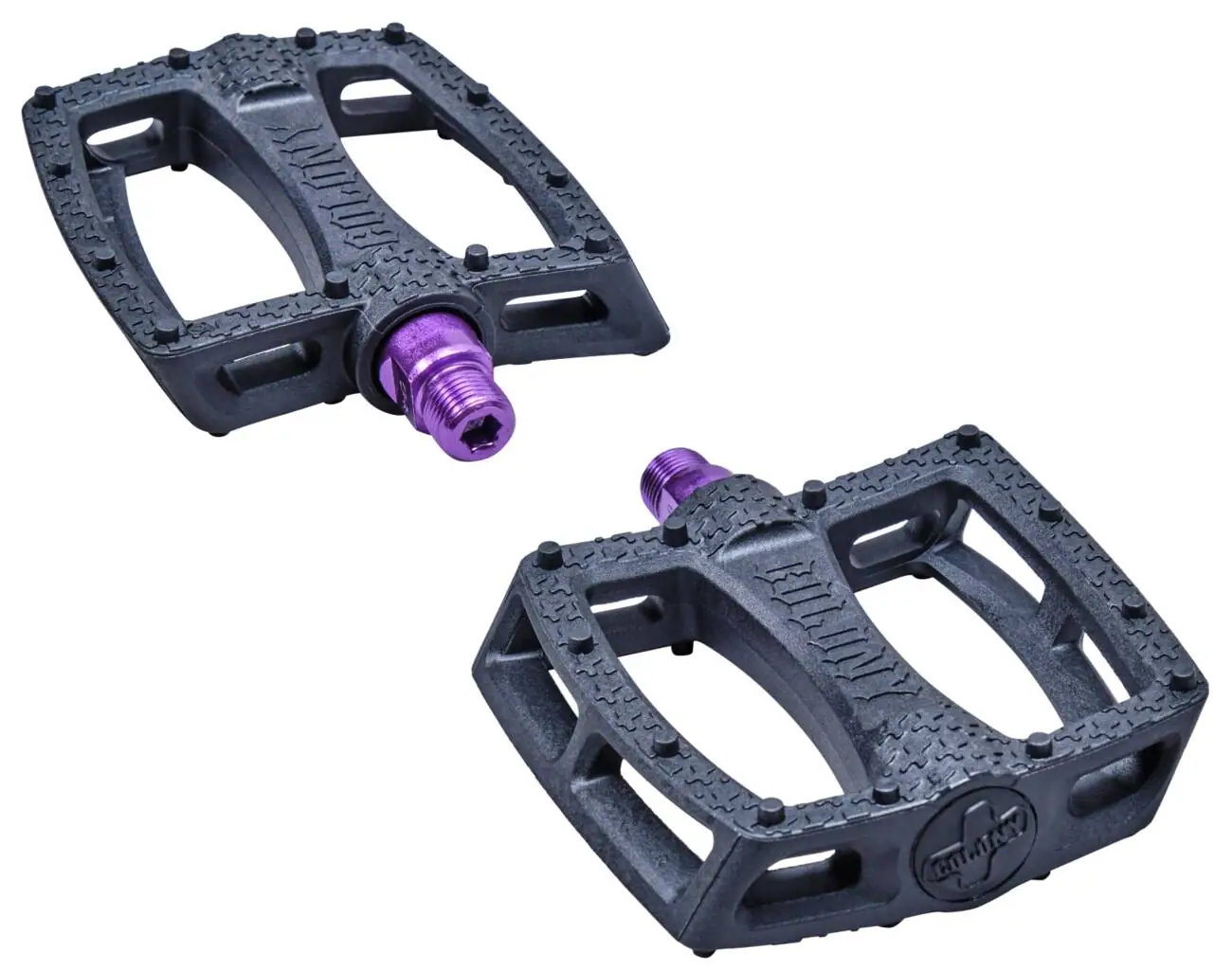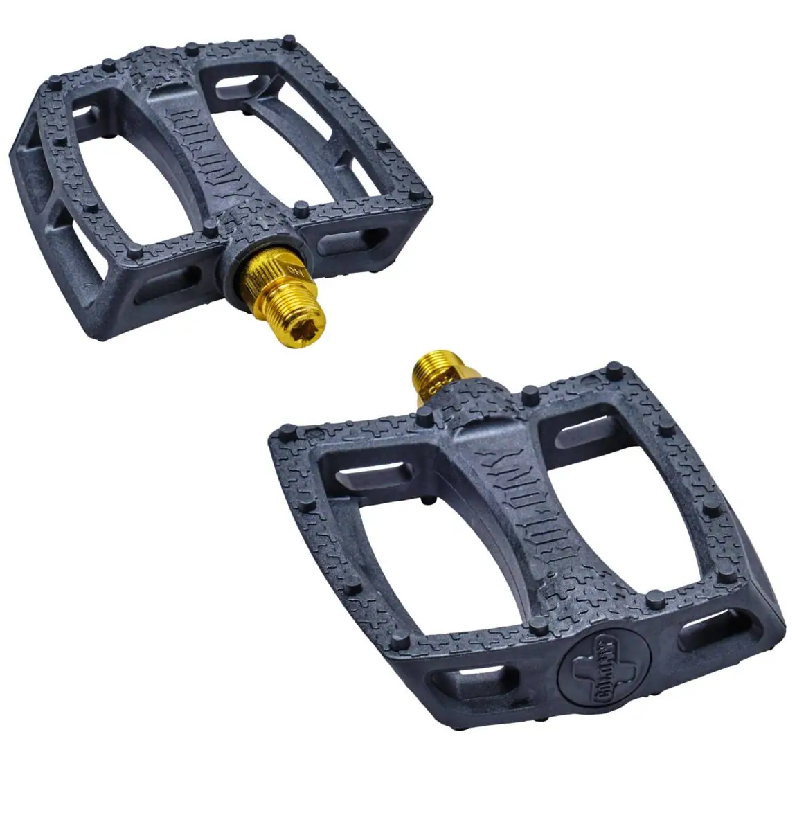 Los Colony de Fantastic son pedales de BMX de freestyle con un diámetro de eje de 9/16″, lo que los hace compatibles con bielas de dos y tres piezas. Están hechos de una combinación de nylon y fibra de vidrio, lo que hace que los pedales sean ligeros, resistentes y capaces de deslizarse como la mantequilla cuando los involucras en tus grinds.