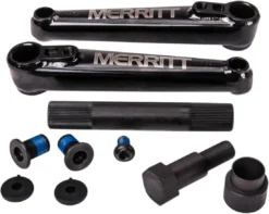 Este juego de bielas de Merritt ha sido diseñado para ofrecer fortaleza y durabilidad. El Battle es un pedalier BMX fabricado en acero cromolio que funciona en combinación con un eje hueco de 22mm. Los topes del eje han sido cortados con un ángulo y están preparados para la instalación de los topes de goma protectora que vienen incluidos en el paquete.