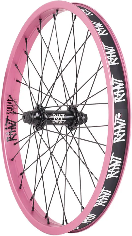 La rueda BMX Party On V2 cuenta con fuertes y duraderos radios del calibre 14, instalados en la testada y probada llanta Squad de Rant, una llanta industrial con aro de doble pared.