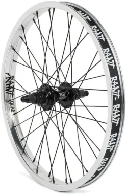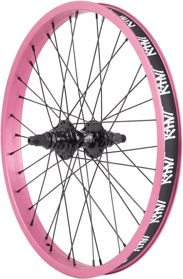 La rueda trasera Party On para BMX Freestyle con cassettes de buje va ya por su segunda edición. Rant se ha tomado muy en serio la actualización de la gama Party On y una de sus principales innovaciones ha sido el desarrollo de ruedas delanteras y traseras aptas para el uso de los protectores de plástico deslizables Party guards. Esto se consigue con conos más anchos y planos.
