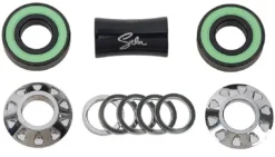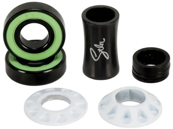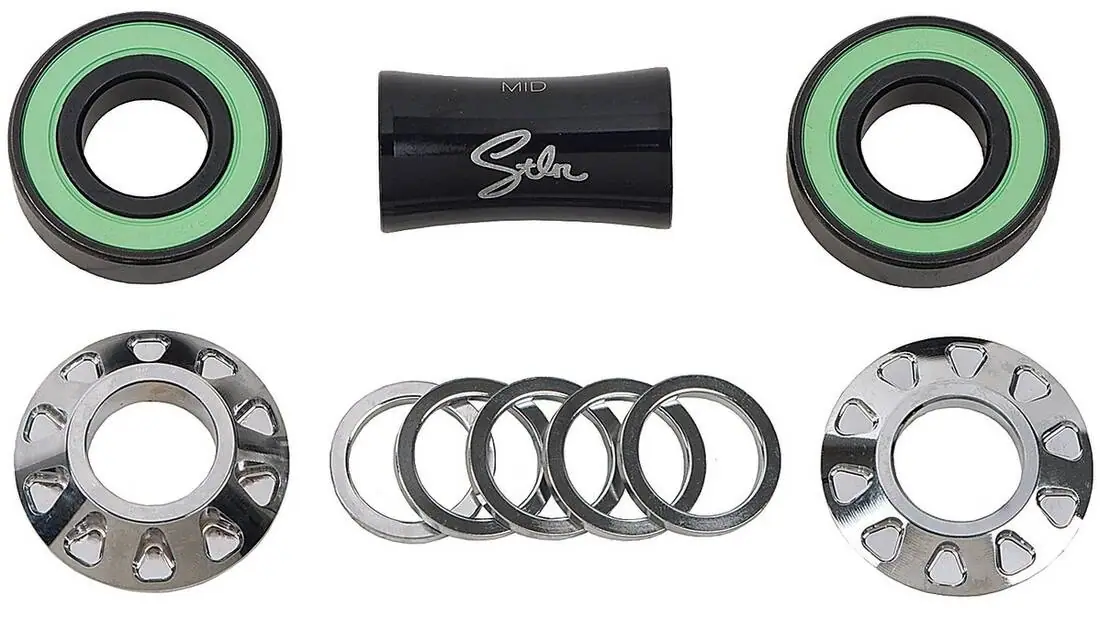 The Revolver Bottom Bracket by Stolen features a characteristic barrel-a-like design with its bullet-drop slots. It comes with mid-sized shells, meaning it’s compatible with frames with a bottom bracket shell diameter of 41 mm.